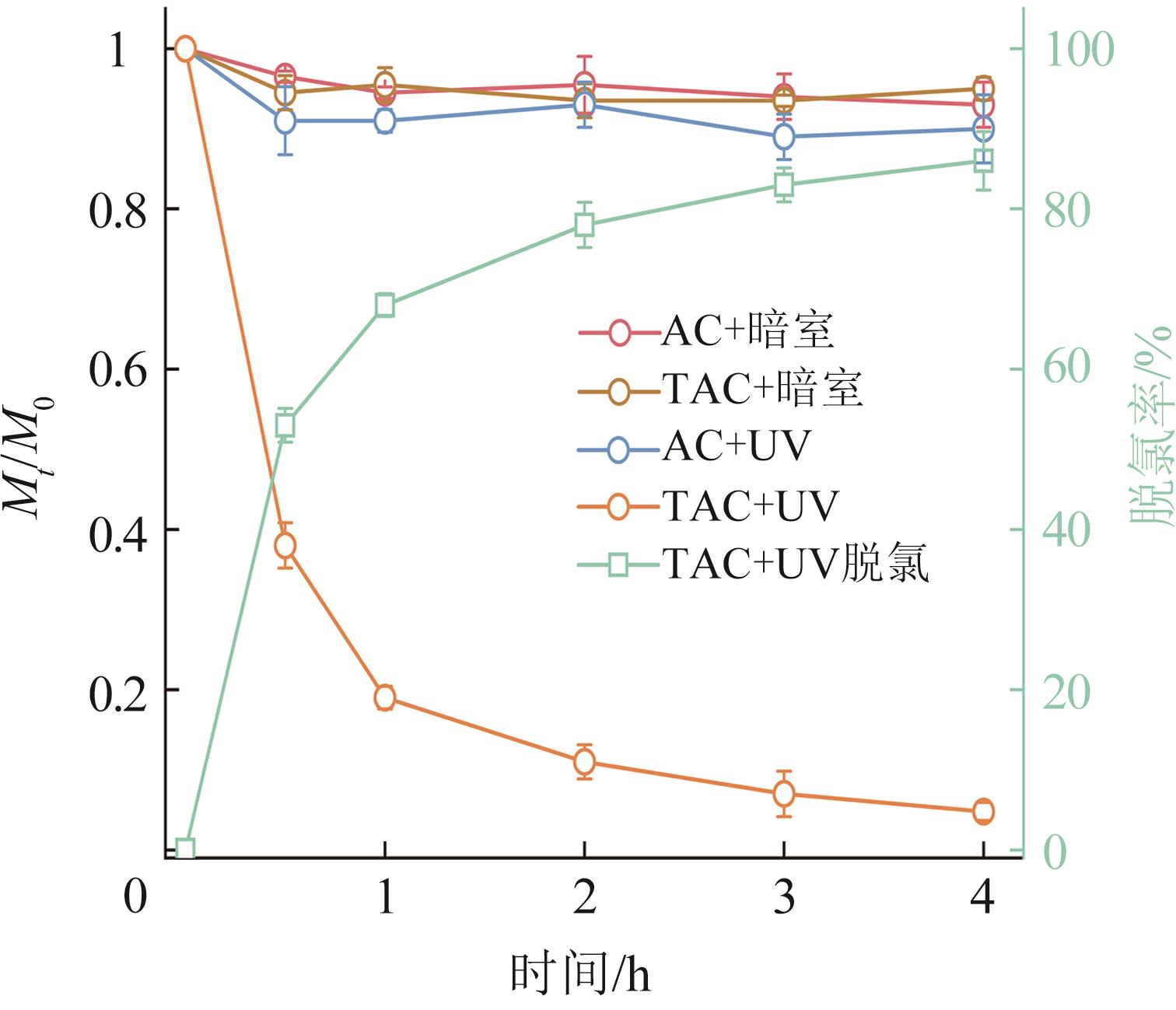 Titanate/activated carbon composite(TAC) was synthesized through a one⁃step hydrothermal treatment method, which could efficiently pre⁃concentrate the target organic pollutant through adsorption in water, and then degraded through photocatalysis under UV light. Results showed that TAC achieved 86.9% of 4-chlorophenol (4-CP) adsorption within 5 min, demonstrating that TAC had faster adsorption kinetic rate and larger adsorption capacity compared with original activated carbon. Moreover, TAC could degrade 95.6% of pre⁃concentrated 4-CP within 4 h through photocatalysis and achieved 85.8% of dechlorination rate. The mechanism enhanced photocatalytic activity of TAC was attributed to the activated carbon and micro⁃carbon components, which could efficiently transfer the photo⁃excited electron, thus inhibiting the recombination of photo⁃generated charge carrier. Hydroxyl radicals(·OH) were proved to be the main reactive species in this reaction system via radical quenching test and radical identification. Meanwhile, the degradation pathway of 4-CP was also confirmed through theoretical calculation on Fukui index and intermediates analysis, which proceeded as C—Cl cleavage after ·OH substitution and ·OH addition.