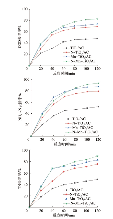 以传统活性炭(AC)粒子电极为载体,采用溶胶-凝胶法制备TiO2/AC粒子电极以及掺N、掺Mn、N-Mn共掺杂改性的TiO2/AC粒子电极,并将几种粒子电极应用于三维光电系统,考察其对实际印染废水的处理性能。XRD表征结果表明,TiO2成功负载于AC表面且以锐钛矿晶型为主,N元素并未取代晶格氧,而是进入TiO2晶格间隙,加快了电荷转移,Mn元素则以间隙掺杂形式进入TiO2晶格,加快了光生空穴(h+)的转移;SEM、EDS和FT-IR结果显示,相比TiO2/AC粒子电极,N-Mn-TiO2/AC粒子电极比表面积显著增大,含氧官能团明显增加;印染废水降解实验结果表明,当实际印染废水中COD、NH4 +-N、TN分别为1 600~1 800、25~40、40~60 mg/L时,N-Mn-TiO2/AC三维光电体系对COD、NH4 +-N、TN的去除率分别为82.9%、93.7%、89.5%,废水处理能耗11.92 kW·h/m3;与TiO2/AC、N-TiO2/AC、Mn-TiO2/AC光电体系相比,N-Mn-TiO2/AC光电体系对COD的去除率分别提高了72.0%、19.8%、12.2%,对NH4 +-N的去除率分别提高了79.2%、18.2%、7.2%,对TN的去除率分别提高了83%、17.9%、8.4%,而体系能耗分别降低了65.4%、61.5%、41.1%。
