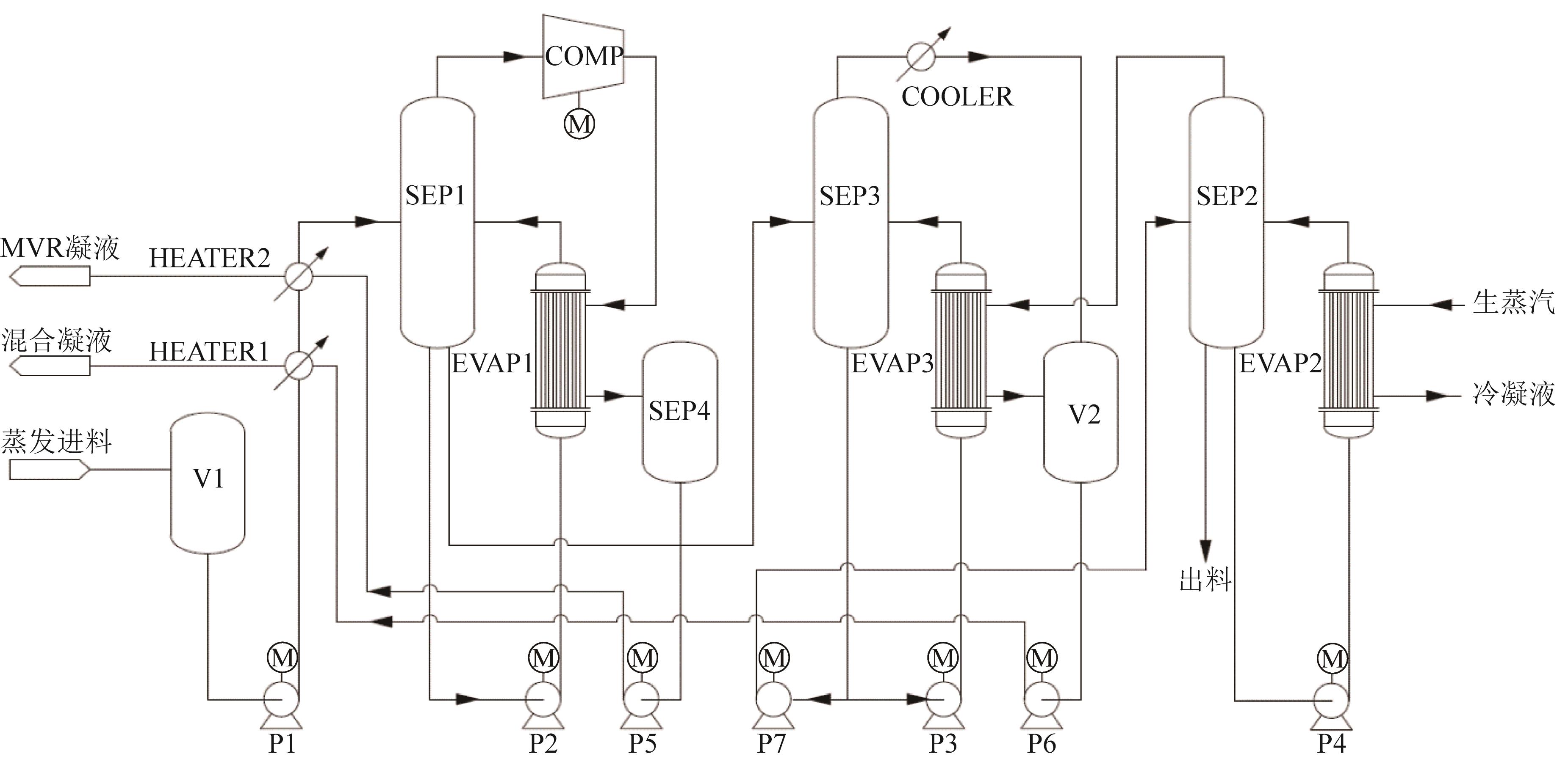 硝酸钠废水是一种高沸点升溶液,采用经验图表-吉辛科公式、仿真模拟和杜林直线法则3种方法对比计算硝酸钠废水的沸点升;结合蒸汽压缩机提升二次蒸汽温度的能力,提出分段式组合蒸发工艺,即“MVR+单效”和“MVR+双效”。利用Aspen Plus软件对“MVR+双效”系统进行流程模拟,定量分析了进料温度对MVR系统补充蒸汽量的影响,考察了MVR出料浓度与压缩比对蒸发器有效传热温差、换热面积和压缩机能耗的影响;对传统三效蒸发、“MVR+单效”和“MVR+双效”进行经济性分析。结果表明:MVR蒸发器加热蒸汽量和补充蒸汽量随进料温度升高线性下降,当进料温度大于81.5 ℃时压缩机的喷淋水量可提供MVR系统所需补充蒸汽量;MVR蒸发部分的最优工况为压缩机压缩比1.9,MVR出口硝酸钠质量分数45%;“MVR+双效”系统年运行成本和年总成本最低。