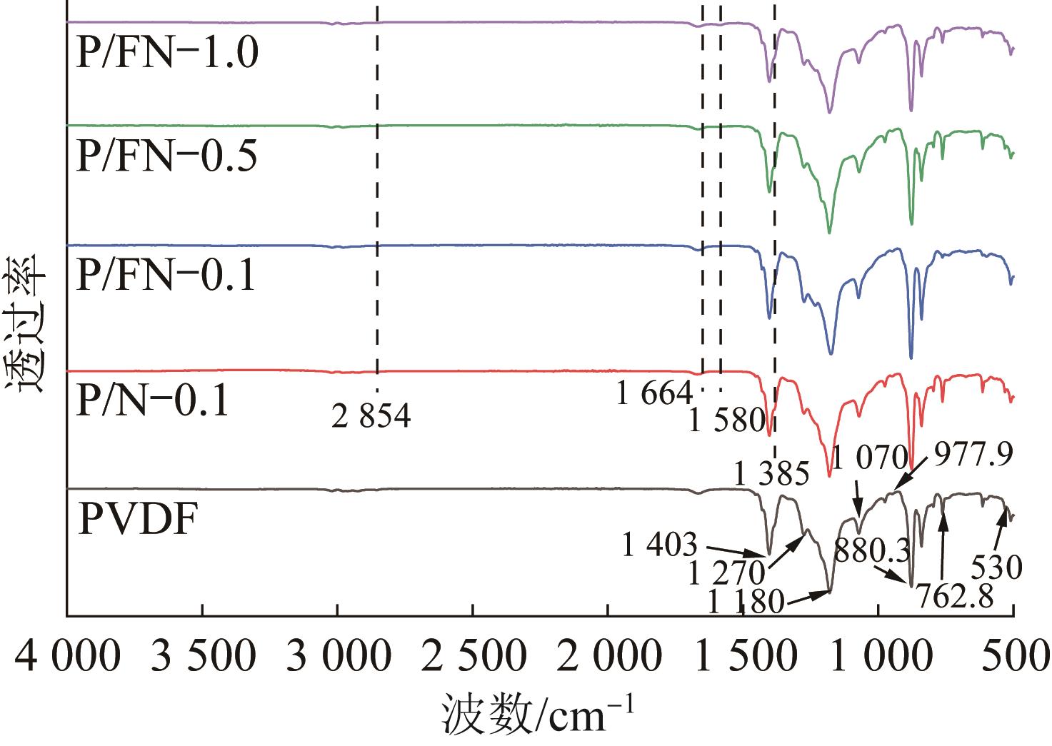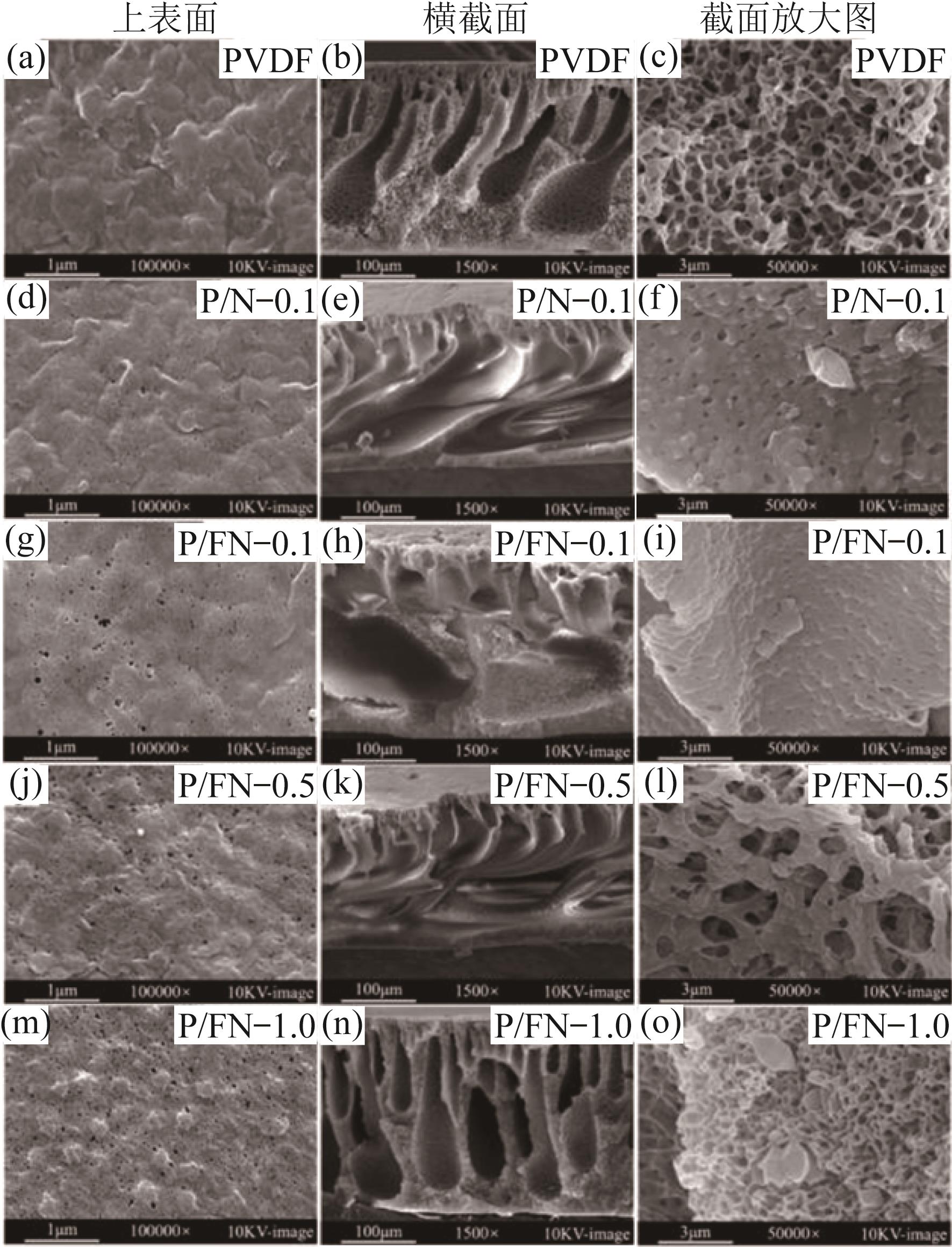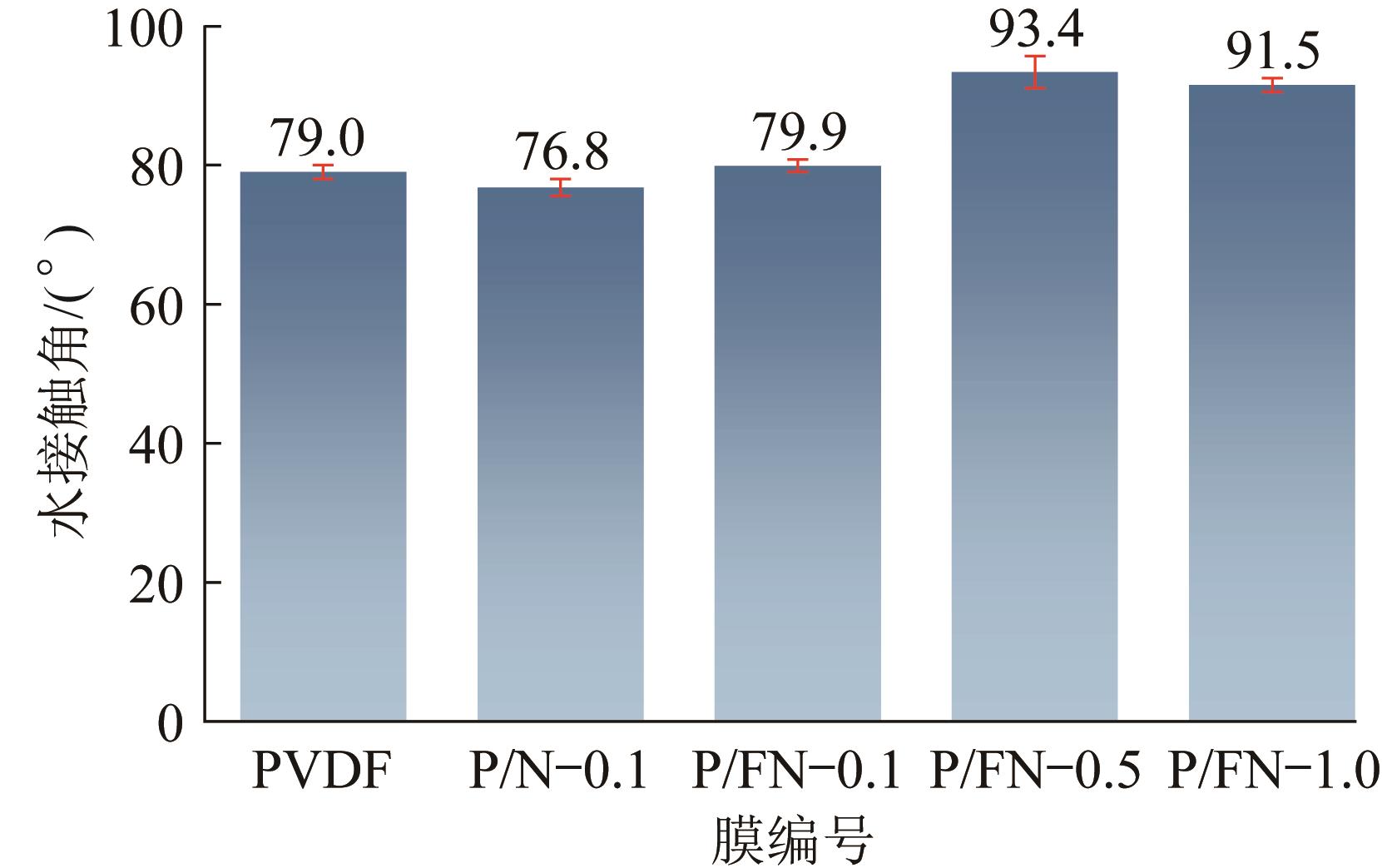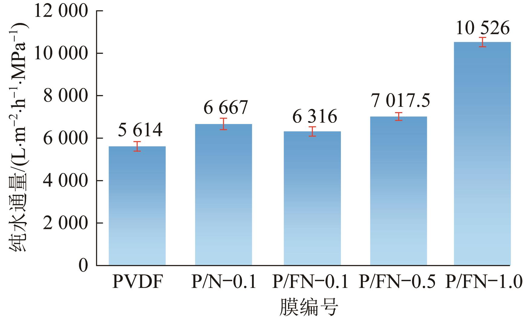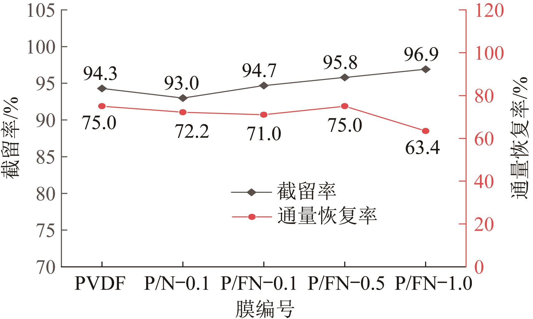 将一种全氟烷基聚乙氧基乙酸(FPEOAA)接枝在NH2-MIL-88B上制备得到含氟MOF(FNM88B),利用FPEOAA内部化学链结构全氟烷基链(—C n F2 n +1—)和聚乙氧基链〔—O—(CH2—CH2O) m —〕所带来的疏油性和亲水性提升MOF的亲水疏油性。将经过FPEOAA改性的FNM88B按照不同比例投加至聚偏氟乙烯(PVDF)中,利用非溶剂致相分离法(NIPs)制备出具有高水通量和高油水分离性能的混合基质膜。结果表明,FNM88B投加质量分数为1%时的共混膜(P/FN-1.0)具有良好的机械强度,拉伸应力(PVDF膜1.27 MPa)提升至2.01 MPa。同时,其纯水通量高达10 526 L/(m2·h⋅MPa),相比PVDF膜〔5 614 L/(m2·h⋅MPa)〕,纯水通量提升了约87.5%。此外,最佳比例改性膜也表现出优异的油水分离性能,截留率达96.9%。