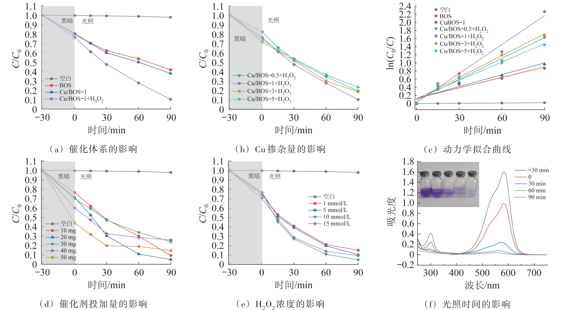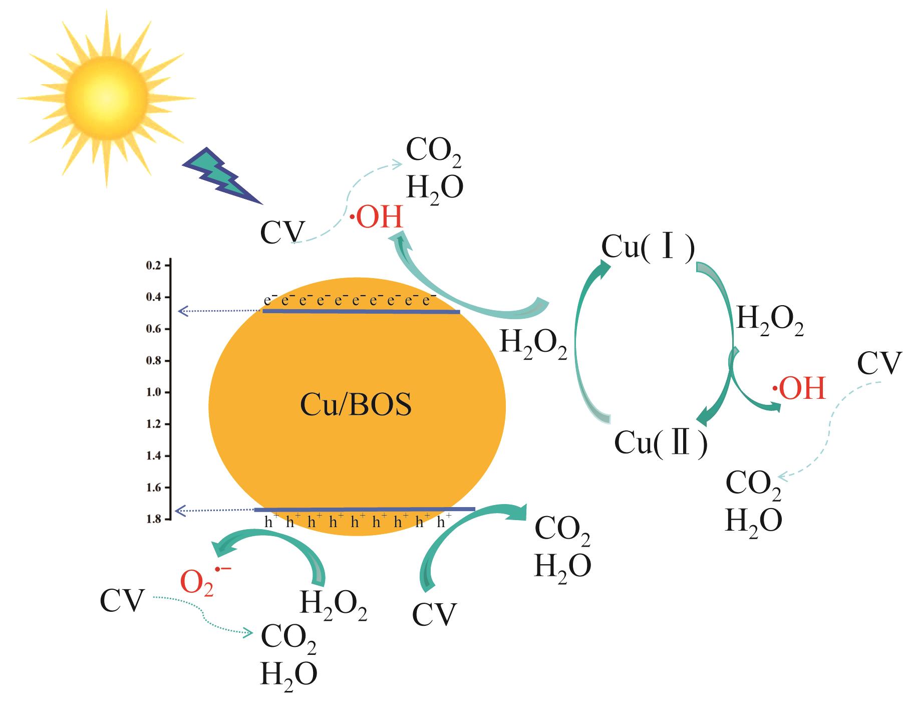 Cu/Bi2O2S (Cu/BOS) photocatalysts were successfully synthesized via a hydrothermal method and comprehensively characterized by scanning electron microscopy(SEM), X-ray diffraction(XRD), UV-vis diffuse reflectance spectroscopy(DRS), photoluminescence spectroscopy(PL), electrochemical impedance spectroscopy(EIS), and photocurrent response measurements. The effects of Cu doping amount, catalyst dosage, and H2O2 concentration on photocatalytic degradation of crystal violet(CV) in the Cu/BOS+H₂O₂ system were systematically investigated, and the degradation mechanism was elucidated. The results demonstrated that Cu doping significantly enhanced the light absorption capacity of BOS and effectively promoted the separation of photogenerated charge carriers. When Cu was doped into BOS (Cu/BOS-1) at a concentration of 1%, under the conditions of adding 20 mg Cu/BOS-1 and 10 mmol/L H2O2 to 50 mL of 10 mg/L CV solution, the CV degradation rate reached 94.99% after 90 minutes of light irradiation. The active species trapping experiments and electron paramagnetic resonance(EPR) indicated that ·OH and O2 ·- were the main active species in the photocatalytic degradation of CV in Cu/BOS+H2O2 system, and ·OH played a major role. H2O2 reacted with electrons (e-) generated by photo to generate substantial ·OH. Simultaneously, a Fenton-like reaction occurred between Cu/BOS and H2O2, where the Cu(Ⅰ)/Cu(Ⅱ) redox cycle facilitated the sustained generation of ·OH. Furthermore, the Cu/BOS catalyst exhibited excellent stability, maintaining over 94% CV degradation rate after four consecutive reuse cycles without significant structural changes.