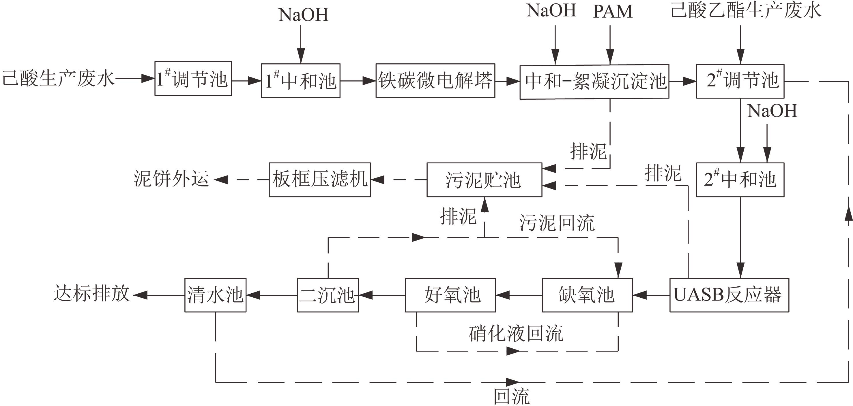 己酸乙酯生产过程中产生的废水具有高COD、低pH、高氨氮和高总氮等特征,高浓度废水(己酸生产工艺废水)采用“中和+铁碳微电解+中和-絮凝沉淀”工艺预处理后,与低浓度废水(己酸乙酯合成工艺废水)混合,而后采用“中和+UASB+A/O+二沉池”工艺处理。工程设计处理规模为160 m3/d(高浓度废水25 m3/d,低浓度废水135 m3/d)。铁碳微电解工艺可有效降解难降解有机物并提高废水可生化性,UASB可实现COD的高效厌氧降解,A/O工艺可确保深度脱氮效果。最终出水COD、NH3-N、TN、SS分别稳定低于300、30、50、150 mg/L,pH维持在6~9,满足河南省《化工行业水污染物间接排放标准》(DB 41/1135—2016)表1要求。该组合工艺具有处理效率高、运行稳定、运行成本低、管理方便等优点,可为具有类似特征的废水处理提供参考和借鉴。