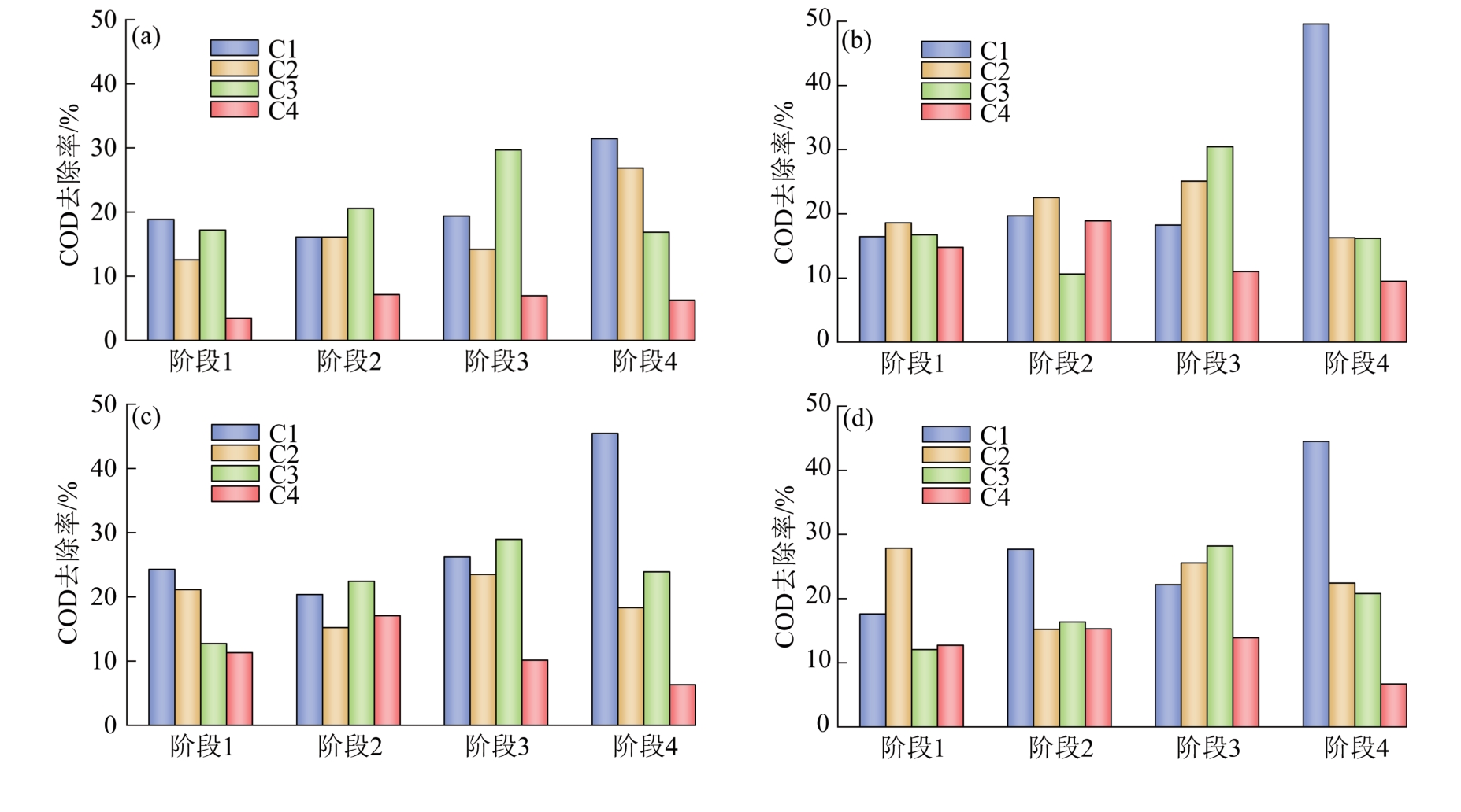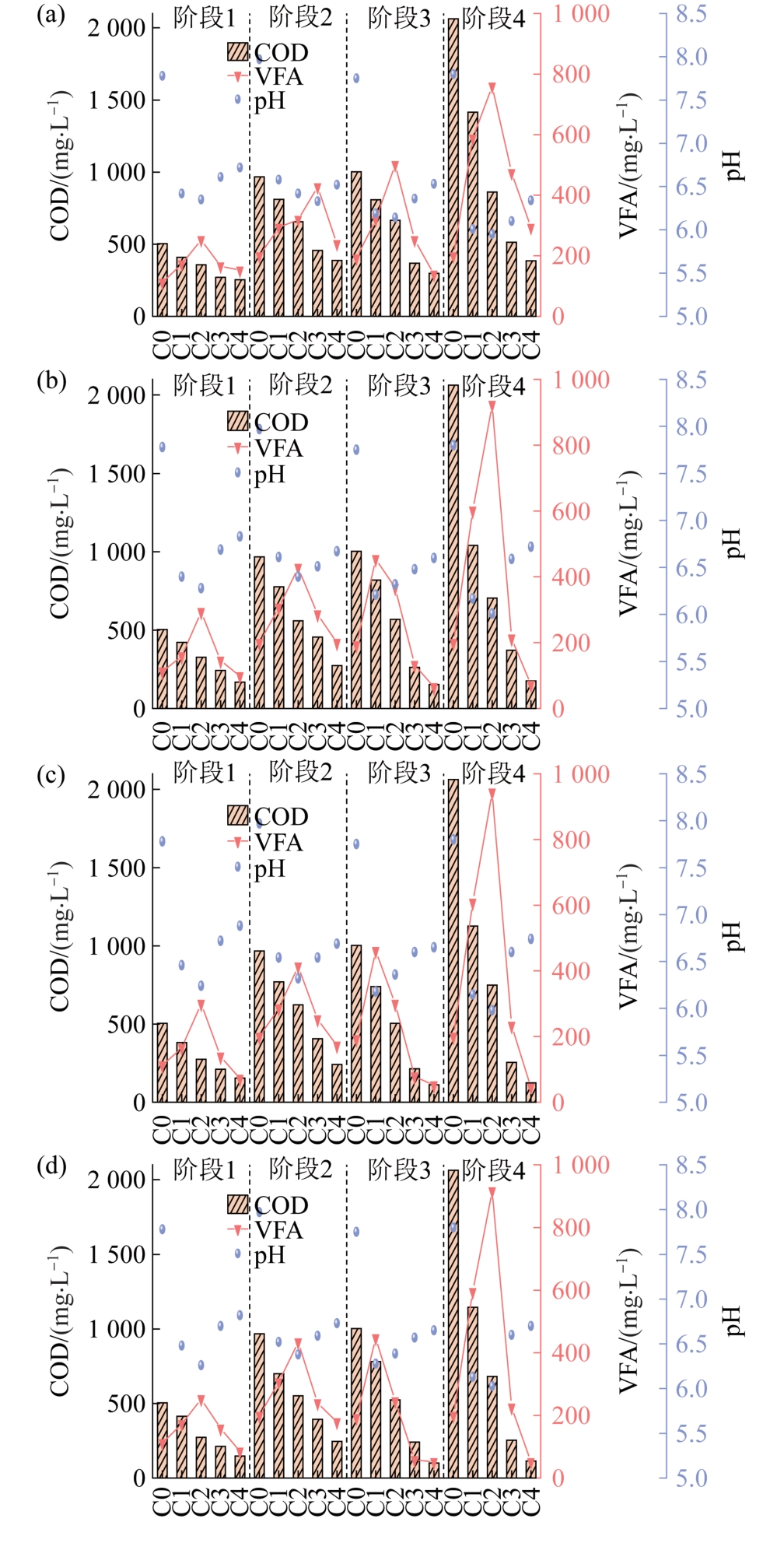 The anaerobic baffle reactor (ABR) equipped with multi-stage compartments can separate acid production and methane production along the water flow direction, and has good operation stability and treatment effect. The addition of bio-carriers can further improve the efficiency of ABR treatment. However, there are few studies on their effects on bio-phase separation and microbial community characteristics of ABR. Elastic bio-carriers, fluidized-bed bio-carriers, and hollow ball bio-carriers were added to ABR to evaluate the treatment efficiency, bio-phase separation, and microbial community structure changes. The results showed that the concentrations of VFA in compartment 2 of the ABR without bio-carriers, elastic bio-carriers, fluidized-bed bio-carriers, and hollow ball bio-carriers were 795.59 mg/L, 922.92 mg/L, 943.03 mg/L, and 916.22 mg/L, respectively, at the influent COD≈2 000 mg/L and HRT=8 h. The concentrations of VFA in effluent were 292.97 mg/L, 71.81 mg/L, 45.00 mg/L, and 51.70 mg/L, respectively. The addition of bio-carriers effectively improved the VFA production and degradation of VFA in methane production. During the whole operation period, the COD removal rates of the reactors with three bio-carriers were significantly higher than that of the reactor with no bio-carriers. When influent COD≈1 000 mg/L and HRT=8 h, the COD removal rates of no bio-carriers reactor, elastic bio-carriers reactor, fluidized bed bio-carriers reactor and hollow ball bio-carriers reactor were 69.63%, 84.63%, 89.45%, and 87.85%, respectively. The microbial community structure analysis showed that the richness and diversity of microbial communities in front end compartment of the ABR with the addition of fluidized-bed bio-carriers increased significantly. The addition of fluidized-bed bio-carriers promoted the growth and enrichment of Methanothrix, Methanofastidiosum and Methanothrix_B, enhanced the interaction between microorganisms, and improved the operation stability and treatment effect of the reactor.
