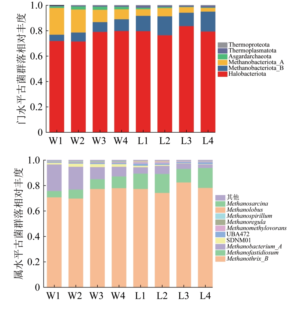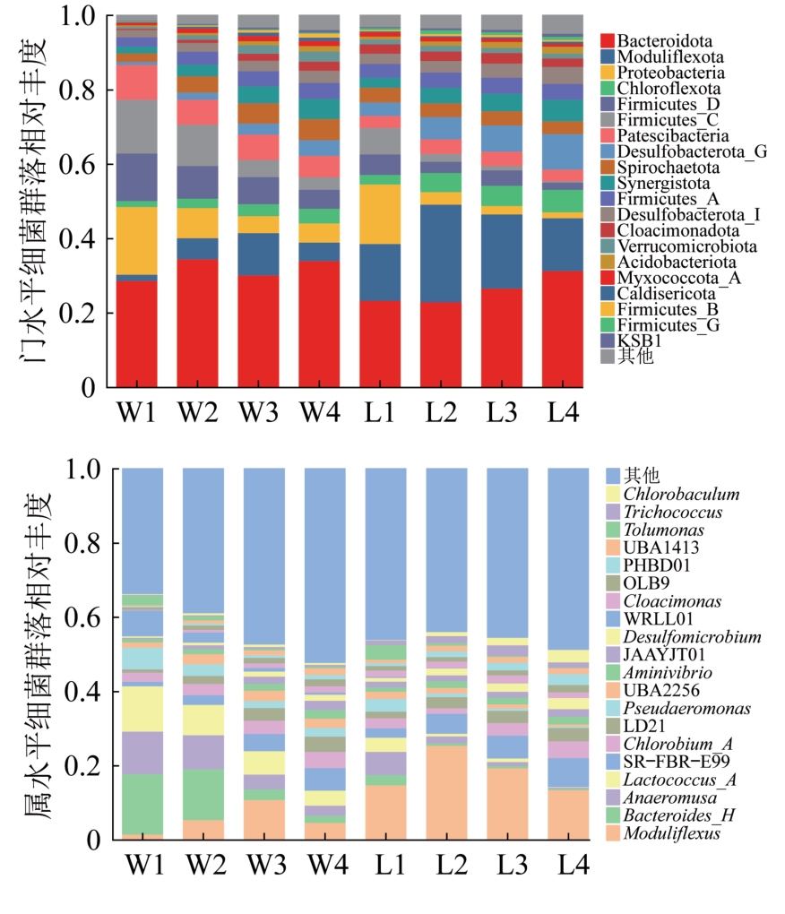 厌氧折流板反应器(ABR)内部设置多级隔室,沿水流方向能够实现反应器产酸和产甲烷的分离,具有良好的运行稳定性和处理效果。填料的投加可以进一步提升ABR的处理效能,但其对ABR生物相分离和微生物群落特性影响的研究很少。通过在ABR中添加弹性填料、流化床填料和空心球填料考察ABR处理效能、生物相分离及微生物菌落的变化情况。结果表明,在进水COD约2 000 mg/L、HRT=8 h时,无填料、弹性填料、流化床填料和空心球填料的ABR第2隔室中挥发性有机酸(VFA)的质量浓度达到最高,分别为795.59、922.92、943.03、916.22 mg/L,反应器出水VFA质量浓度分别为292.97、71.81、45.00、51.70 mg/L,填料的投加有效提高了产酸过程VFA产量及产甲烷过程对VFA的降解。整个运行期间,添加填料的反应器中COD去除率明显高于无填料反应器。当进水COD约1 000 mg/L、HRT=8 h时,无填料、弹性填料、流化床填料和空心球填料的反应器中COD去除率分别为69.63%、84.63%、89.45%和87.85%。ABR各隔室微生物群落结构分析表明,添加流化床填料的ABR前端隔室中微生物群落的丰富度和多样性明显增加。流化床填料的加入促进了细菌Methanothrix和古菌Methanofastidiosum、Methanothrix_B的生长和富集,增强了微生物之间的互营关系,提高了反应器运行稳定性和处理效果。
