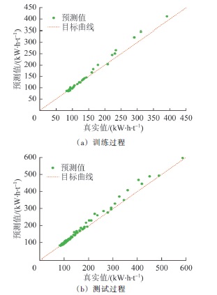 Mechanical vapor recompression (MVR) and vacuum membrane distillation system is a new technology for treating sulfuric acid waste, and the performance prediction is a key to achieving intelligent, efficient, and stable operation of the system. In this paper, an experimental device for MVR and vacuum membrane distillation system was built. Multi-condition tests were carried out with sulfuric acid solution as evaporation object (sulfuric acid concentration of 5%-30%, temperature of 70-90 ℃, flow rate of 5-25 m3/h, steam compressor frequency of 5-50 Hz), and 170 actual valid operation data were obtained. On this basis, a multi-layer perceptron-support vector regression model was constructed to predict the unit water production energy consumption of the system. 136 and 34 data were selected as the training and testing sets respectively to train and test the model. The results showed that the predicted value of MLP-SVR model was highly consistent with the real value of energy consumption per unit mass of water yield. The R 2 in the training and testing processes were 0.998 and 0.980 respectively, the average absolute errors were 2.749 kW·h/t and 6.201 kW·h/t respectively, and relative errors were less than 20%. The model demonstrated excellent generalization ability while maintaining high fitting accuracy. Therefore, the established MLP-SVR model could accurately and efficiently predict the energy consumption per unit mass of water produced in the MVR vacuum membrane distillation system, providing reliable data support for system optimization and intelligent operation.