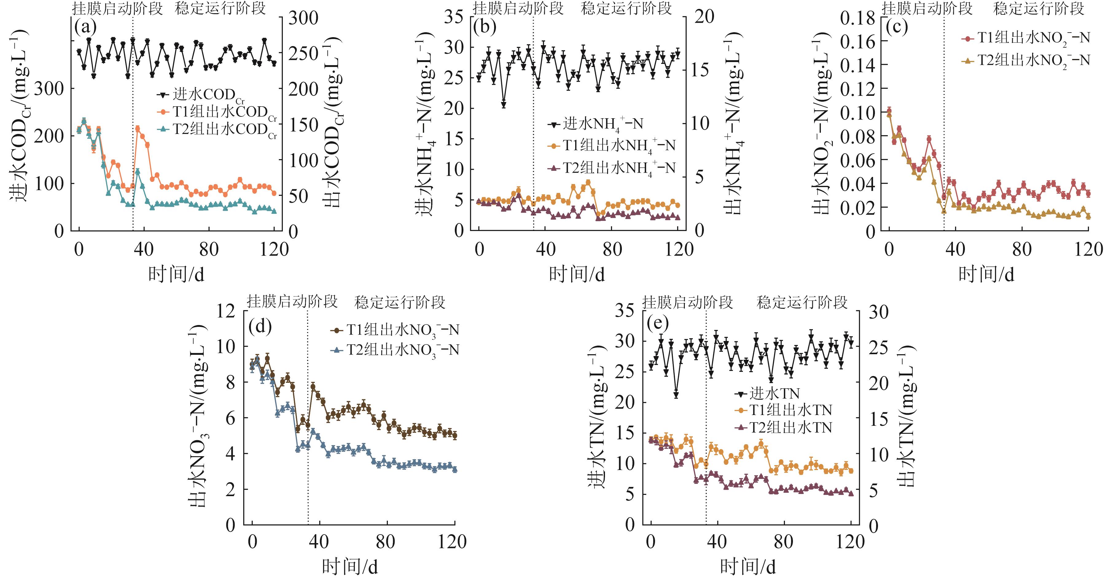 为了强化立体弹性填料(TEF)的挂膜性能,提升设置TEF的一体化固定膜活性污泥(IFAS)工艺(简称泥膜复合工艺)的污染物去除性能,通过熔融共混法制备了聚季铵盐-10与四氧化三铁复合改性的TEF,以商用TEF为对照,构建两组IFAS反应器(T1采用商用TEF;T2采用改性TEF),系统考察了两种填料表面的理化性质、挂膜性能,探究了T1、T2反应器对污染物的处理效果,并利用高通量测序技术从微生物层面解析了改性TEF强化反应器脱氮的机制。结果表明:改性TEF表面的水滴接触角为75.2°,低于商用TEF(85°),Zeta电位提升至-17.5 mV(商用TEF为-51.1 mV),且表面粗糙度增加,单位质量改性TEF的生物膜附着量高达48.02 mg/g,是商用TEF的1.27倍;反应器稳定运行后,添加改性TEF的反应器出水CODCr、氨氮、TN平均值为33.55、1.40、4.84 mg/L,较商用TEF的反应器出水COD、氨氮及TN平均去除率分别提高了6.96%、3.61%、11.19%,表现出更好的污染物去除能力和稳定性,且可以快速适应系统内环境的变化;高通量测序结果显示,改性TEF能够富集脱氮相关的功能性菌群,并且提高与污染物去除相关的功能基因丰度,从代谢层面支持了其优异的污染物去除性能。