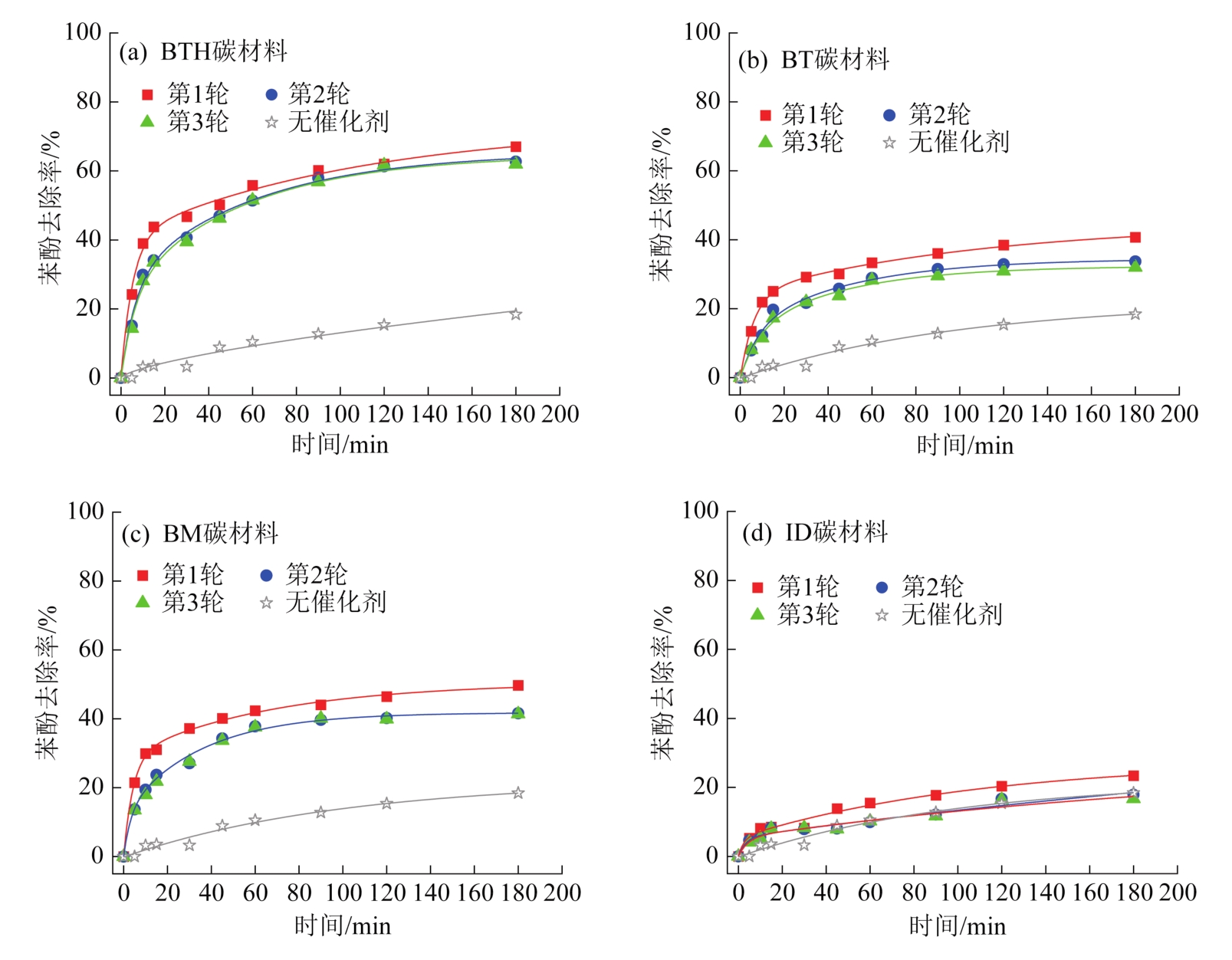 采用过硫酸盐-氧气(K2S2O8-O2)耦合技术处理苯并噻唑(BTH)、苯并三唑(BT)、苯并咪唑(BM)、吲哚(ID) 4种苯并杂环混合物的模拟废水。160 ℃时,1.0 g/L的BTH、BT、BM、ID及混合污染物转化为球形聚合物的产率分别为66%、62%、57%、60%及68%,溶液中COD去除率分别为92%、90%、86%、91%及94%;进一步提高反应温度,几种污染物溶液的COD脱除率均达90%以上。利用密度泛函(DFT)理论对反应物分子结构、化学键长及其电负性进行了研究,结果表明,键长越长的反应物,其生成的聚合物微球尺寸越大;电负性越大,反应活性越高,越有利于COD去除。苯并杂环类污染物降解后生成的聚合物经碳化处理后转化为碳材料,可用于催化过硫酸盐氧化去除苯酚。相比不加催化剂体系,N、S共掺杂碳材料(BTH碳材料)对苯酚的去除率提高了将近48%,N掺杂碳材料(BM、BT碳材料)对苯酚的去除率达到40%以上,且3轮循环使用后各掺杂碳材料活性仅有小幅改变。因此,K2S2O8-O2耦合技术处理有机废水尤其是杂环有机废水具有显著优势,可同时实现碳资源循环利用和COD去除双重目的。
