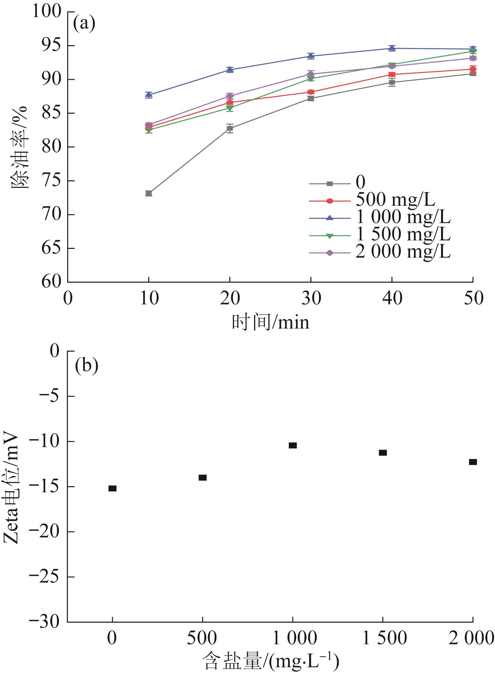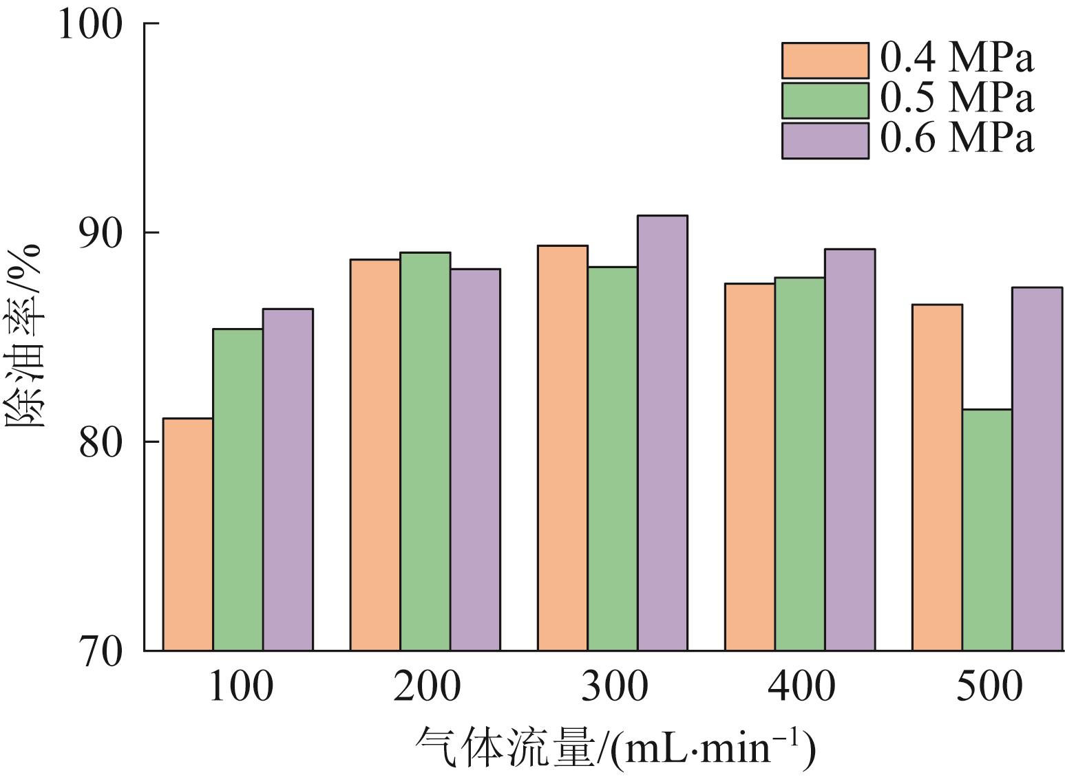 The simulated oily wastewater with initial pH of 7.9 and oil concentration of 200 mg/L was prepared using mineral oil. It was treated by micro-nano bubble enhanced air flotation technology. The effects of micro-nano bubble preparation conditions and the pH and salt content of oily wastewater on oil removal efficiency by air flotation were systematically studied, and the correlation between micro-nano bubble properties and oil removal efficiency by air flotation was explored. The results showed that under the conditions of gas flow rate of 300 mL/min and dissolved gas pressure of 0.6 MPa, the micro-nano bubbles generated by the micro-nano bubble generation device had the best treatment effect on oily wastewater, with an oil removal rate of 90.8%. The pH of wastewater had a significant impact on the effectiveness of air flotation. By changing the Zeta potential of micro-nano bubbles, the coalescence of bubbles and their adhesion to oil droplets were affected, thereby affecting the air flotation. Under acidic conditions, air flotation had a better oil removal effect, with a maximum oil removal rate of 94.15%. The salt ions in the solution would change the double-layer structure of the bubbles by shielding their surface charges, which affected the stability of the bubbles and ultimately affected the air flotation. As the dosage of sodium chloride in the solution increased, the oil removal effect showed a trend of first increasing and then decreasing. The optimal oil removal effect was achieved at 1 000 mg/L, with an oil removal rate of 94.6%.
