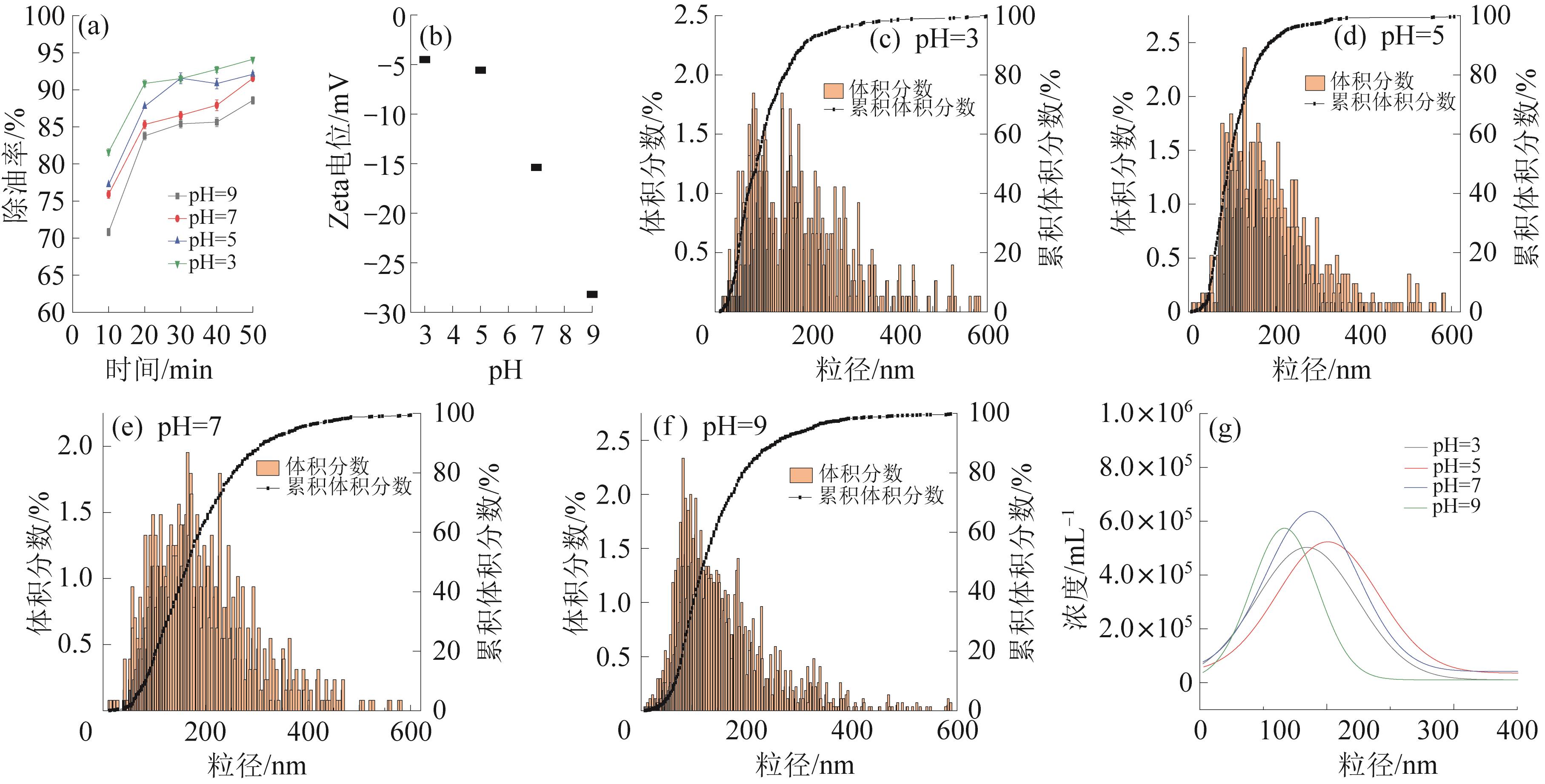 采用矿物油制备初始pH=7.9、油质量浓度为200 mg/L的模拟含油废水,通过微纳米气泡强化气浮工艺对其进行处理,系统研究了微纳米气泡制备条件及含油废水pH、含盐量对气浮除油效果的影响,并探究微纳米气泡性质与气浮除油效果的相关性。结果表明,在气体流量300 mL/min、溶气压力0.6 MPa条件下微纳米气泡发生装置产生的微纳米气泡对含油废水的处理效果最佳,除油率可达90.8%;废水pH对气浮效果有重要影响,其通过改变微纳米气泡的Zeta电位影响气泡的聚并以及与油滴的附着行为,进而影响气浮效果,在酸性条件下气浮除油效果较好,除油率最高可达94.15%;溶液中的盐离子会通过对气泡表面电荷的屏蔽作用改变其双电层结构,影响气泡稳定性并最终影响气浮效果,随着溶液中氯化钠投加量的增加,除油效果呈先升后降的趋势,在1 000 mg/L时达到最佳除油效果,此时油去除率为94.6%。