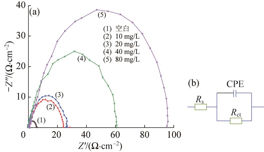 A novel polyaspartic acid derivative (CD/PASP) was synthesized, and used as a green, efficient, and economical corrosion inhibitor to inhibit the corrosion behavior of Q235 low carbon steel in 0.5 mol/L phosphoric acid solution. The structure of CD/PASP was verified by infrared spectroscopy (FTIR) and nuclear magnetic hydrogen spectroscopy (1H NMR), and thermogravimetric analysis showed its excellent thermal stability within 200 ℃. The weightlessness experiment showed that when the dosage of CD/PASP was 80 mg/L, it had an inhibitory effect on the corrosion of Q235 steel, with a corrosion inhibition rate (η) of up to 85.19%. The adsorption of CD/PASP on the surface of Q235 steel conformed to Langmuir adsorption isotherm model, and the adsorption free energy (ΔG ≈-38.92 kJ/mol) indicated that its adsorption was a spontaneous process, involving both physical and chemical adsorption mechanisms. Polarization curves and electrochemical impedance spectroscopy indicated that CD/PASP was a hybrid corrosion inhibitor that could form a protective film on the metal surface to effectively block the corrosion process. Surface analysis (SEM, AFM, XPS, etc.) further revealed that CD/PASP formed N—Fe chemical bonds with the steel substrate through nitrogen heteroatoms in the molecule, forming a hydrophobic protective layer on the metal surface that effectively blocked corrosive media and suppressed charge transfer processes. The synthesized CD/PASP was an efficient steel corrosion inhibitor with great potential for application in the field of industrial metal corrosion prevention.