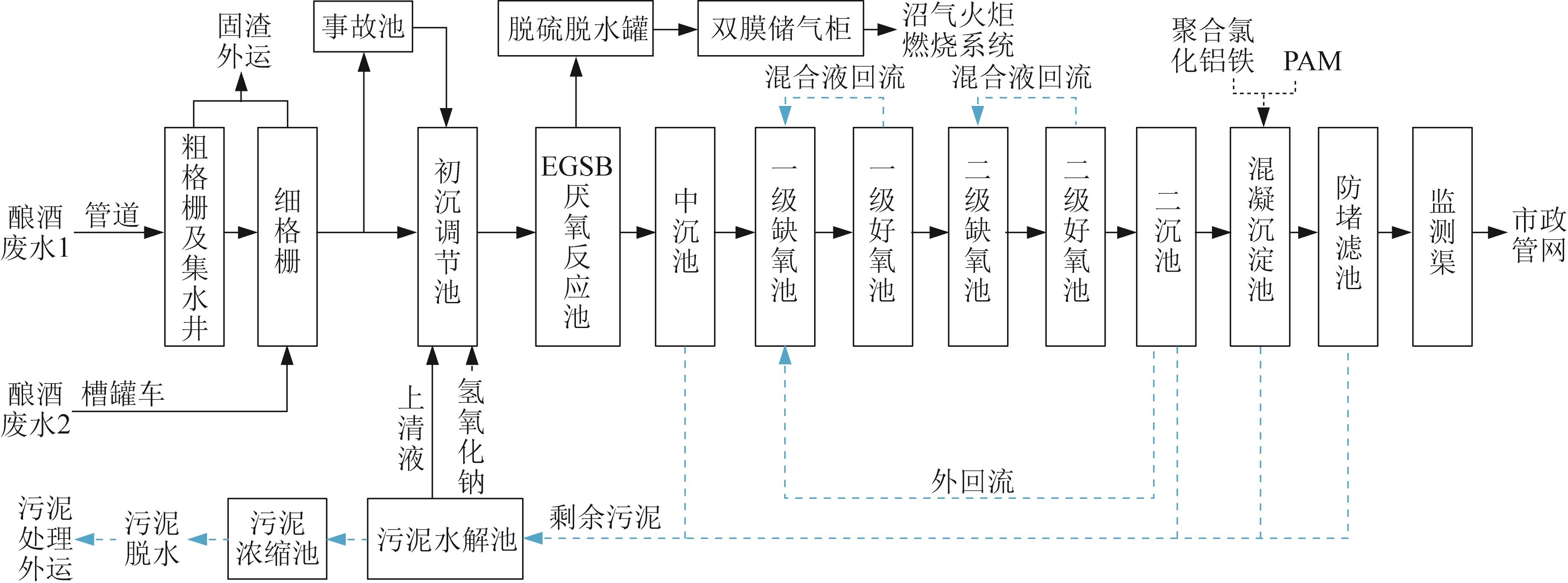 针对中小型分散式白酒酿造企业生产废水存在的空间离散、水质水量时空波动显著及季节性污染突出等技术难题,在四川某白酒产业集聚区设计并建设了一座处理规模为1 000 m3/d的白酒废水集中预处理示范工程。工程采用“罐车转运+管道输送”的分级收集体系,实现废水全流程密闭化收集;核心处理单元运用“多模式膨胀颗粒污泥床(EGSB)反应器+两级A/O生物池”组合工艺,通过动态调控运行参数,确保出水水质稳定优于《发酵酒精及白酒工业水污染物排放标准》(GB 27631—2011)间接排放限值。污泥处置环节集成“污泥消解-重力浓缩-板框压滤”全流程减量化技术,使污泥含水率稳定降至60%以下。
