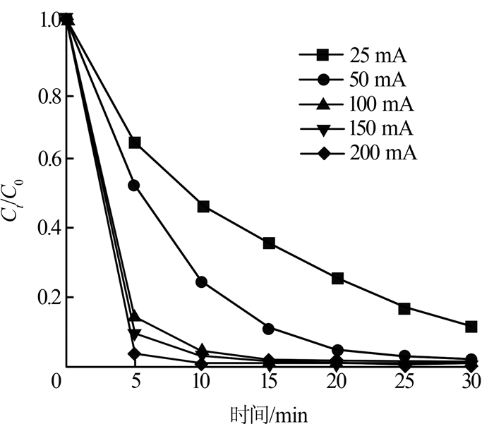 在pH和曝气条件相同的前提下,考察电流对甲基橙去除效果的影响,结果见图4。