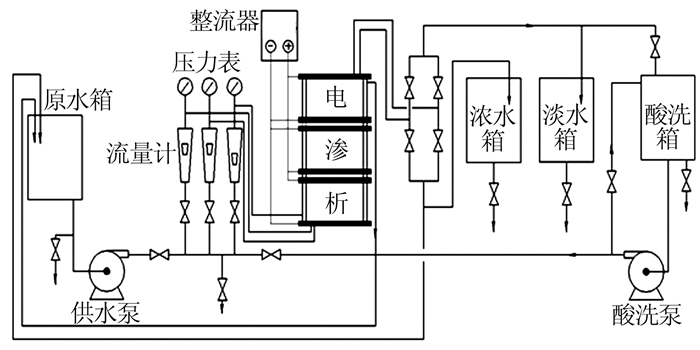 试验用电渗析设备由中海油天津化工研究设计院有限公司设计制造,型号为DSA-IV-3X6-160,规格为200 mm×400 mm×0.9 mm,160对膜组成的三级六段膜堆。离子交换膜为磺酸型聚乙烯异相阳离子交换膜和季铵型聚乙烯异相阴离子交换膜。隔板采用聚丙烯单双丝编织的无回路网与隔板框热烫而成,具有水流分布均匀、有效面积大、电耗小的特点。电极采用钛丝涂二氧化钌,既可作阳极,又可作阴极,并且耐腐蚀性能优良,适用水质范围广。整流器型号为TSCA-20/120,直流输出电流20 A,直流输出电压0~120 V,供水泵型号为CHL2-20,扬程18.6 m,流量0.6 m3/h,功率0.37 kW。