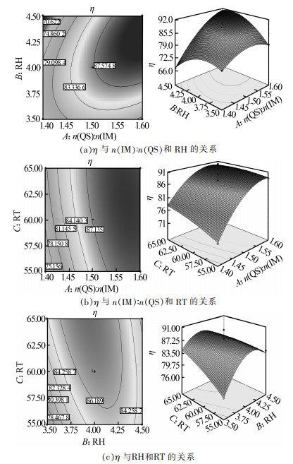 由图1可知,在n(QS):n(IM)、RH和RT这3个影响因素的交互作用中,对于缓蚀率来说,n(QS):n(IM)和RT交互作用最大,表现为曲线较陡,RH和RT次之,n(QS):n(IM)和RH最小,表现为曲线较平滑。