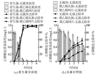 统计分析表明,前7 d,实验组中着生藻-聚乙烯网片组的磷酸盐去除率与另两组之间差异显著(P < 0.05)。由此表明,聚乙烯网片作为载体更有利于前期磷酸盐的去除,这主要是由于藻体和微生物在不同载体上的附着能力不同,聚乙烯网片的网孔密集,成膜过程中形成了三维结构,相对比表面积较大,为微生物附着提供了更多空间和更理想的生长环境〔12〕。而有无载体对总磷的去除效果区别极显著(P < 0.01)。增加载体后,TP去除率达到90%以上用时3 d,比无载体时缩短了6 d;而PO43--P去除率达到90%以上的时间分别为3 d和5 d。而对比着生藻-聚乙烯孔板组和着生藻-聚乙烯网片组发现,9 d实验周期中,后者的TP和PO43--P平均去除速率最快,且最终的去除率和处理效果都优于其他两组。这与吴睿等〔13〕对于不同人工载体处理富营养化水体的研究结果类似。实验进行到第9天时,聚乙烯孔板组和聚乙烯网片组的总磷去除率开始出现显著差异(P < 0.05),且聚乙烯孔板组的磷浓度出现回升。聚乙烯网片作为载体时,混合着生藻生长周期更长,而聚乙烯孔板组中的藻体和微生物开始进入衰老期,对磷的固定能力降低〔14〕。此外,不同载体上附着微生物群落结构和组成的差异也可能是影响载体水质净化能力的重要因素〔13〕。