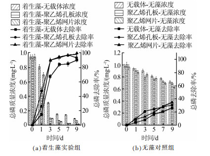 (2)实验周期内,7 d时着生藻-聚乙烯网片组TP去除率达到96.81%,比着生藻-无载体组高11.70%;9 d时着生藻-聚乙烯网片组TP去除率达到98.94%。运行周期可针对不同去除率需求选择为7~9 d。