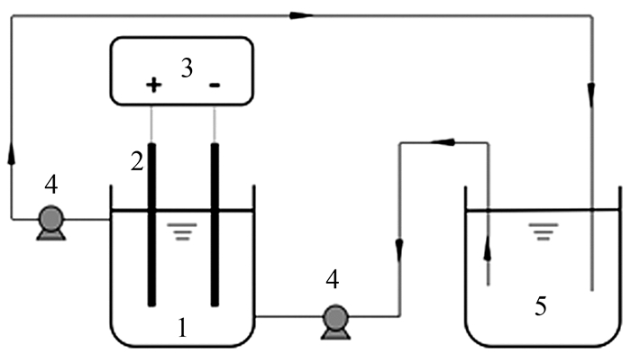 实验装置如图1所示,本实验装置包括除垢反应器、电极板、低压直流电源、蠕动泵、储水槽及连接管路部分,其中极板垂直于电解槽内,规格为100 mm×50 mm,间距为150 mm。