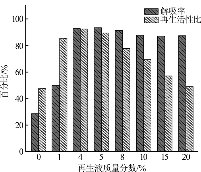 由图2可知,清水浸泡实现了沸石的部分再生,但效果欠佳。当NaOH溶液质量分数为5%时,解吸率达到92.43%,之后变化趋于平缓。随着NaOH再生液质量分数的增加,再生活性比呈曲线变化。