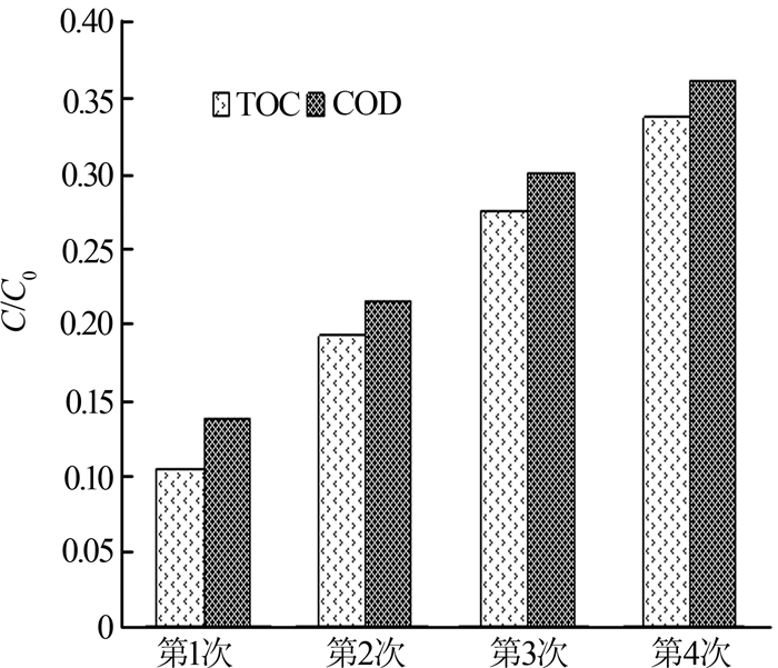 考察了催化剂回收次数对催化湿式氧化处理医药废水TOC、COD效果的影响,其中反应温度为190 ℃,催化剂投加量为1.5 g/L,氧分压为1.6 MPa,反应时间为3 h,结果见图6。
