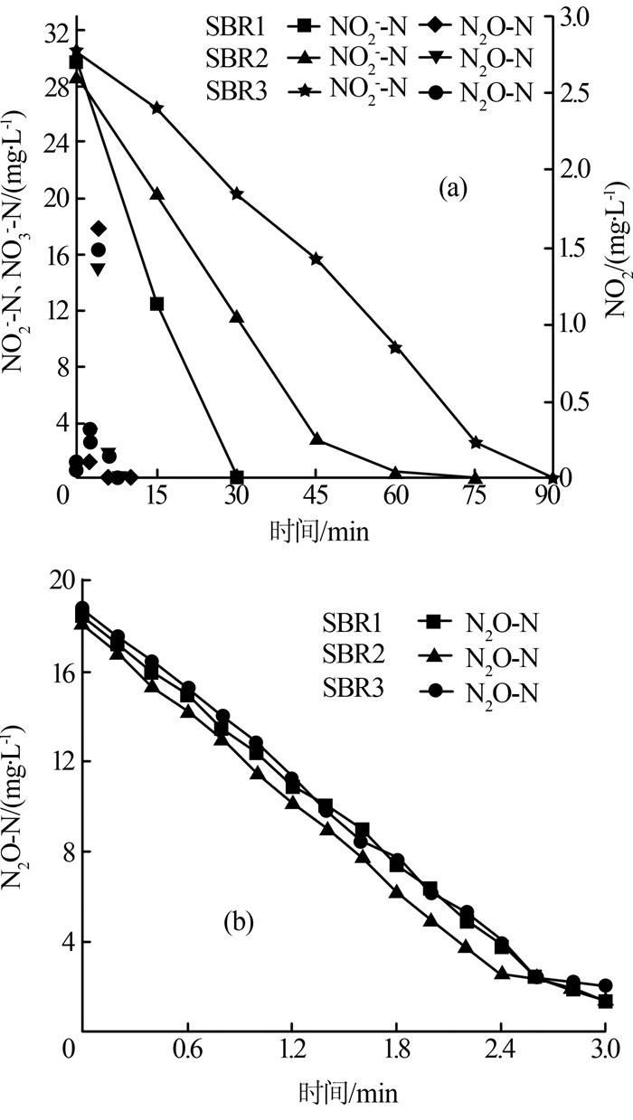 由图3(a)可知,与NO3-还原类似,NO2-还原过程的初始阶段,分别出现了1.62、1.36、1.48 mg/L N2O-N积累,大于NO3-反硝化过程N2O积累量,这表明在NO2-的还原过程中,同样存在N2OR合成滞后于NiR的现象,除此之外,反硝化初始阶段高浓度的NO2-(约30 mg/L)可能对N2OR具有一定的毒性,使得产生的N2O无法迅速被还原至N2,从而导致其N2O积累量大于NO3-还原过程。10 min后,NO2-反硝化过程中无N2O的积累,表明当N2OR合成后,其获得电子的能力并没有受到NO2-的影响。