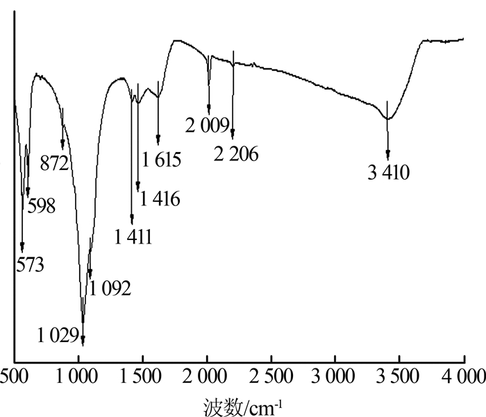 准确称取0.100 0 g的CMBB置于50 mL三角瓶中,加入20 mL一定浓度的Cd2+溶液,Cd2+溶液中亦含有一定浓度的NaNO3作为背景电解质。将三角瓶置于一定温度的恒温振荡器中,在150 r/min下振荡吸附一定时间。以0.45 μm滤膜过滤,用火焰原子吸收分光光度计(AA-6300F,日本岛津)测定滤液中Cd2+浓度。每组试验在相同条件下做3个平行。若无特别说明,试验反应条件为Cd2+初始质量浓度为100 mg/L,pH=5,NaNO3浓度为0.01 mol/L,吸附温度为25 ℃,吸附时间为12 h。