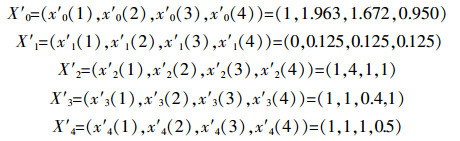 由式(4)得绝对关联度:ε01=0.501、ε02=0.753、ε03=0.494、ε04=0.496,然后计算相对关联度,先求出xi(i=1,2,3,4)的初值项,见式(5)。