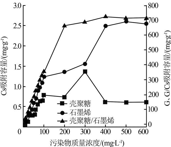 由图3可以看出,随着污染物浓度的增大,Cs对染料的吸附容量缓慢增大,在污染物质量浓度到达300 mg/L时出现峰值,但整体的吸附容量偏低。而G和G/Cs对染料的吸附性明显较好,在低浓度的变化范围中,随着污染物浓度增加,材料的吸附容量都逐渐增加,G/Cs在污染物质量浓度达到400 mg/L时吸附容量达到最大值724.24 mg/g,之后在700 mg/g上下波动。这可以说明污染物质量浓度为400 mg/L时,G/Cs材料吸附性能达到最佳状态。