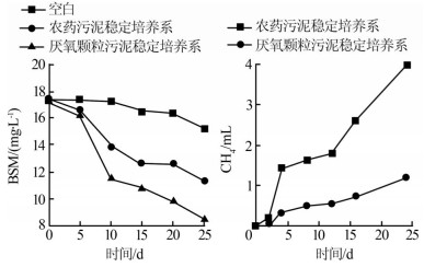 取50 mL厌氧发酵瓶,加入10 mL Widdle培养基,灭菌后向其中加入等体积的农药污泥和厌氧颗粒污泥的稳定培养系,再加入BSM溶液,使其最终质量浓度在20 mg/L左右。放置在37 ℃恒温箱中黑暗静置培养。每隔5 d取样检测生成的甲烷量(气相色谱法)和BSM的含量。