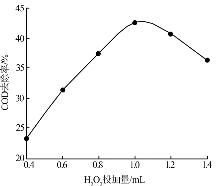 (1)对废水进行Fenton处理,pH固定为3,投加1 mL的H2O2,0.6 g的FeSO4条件下,Fenton处理废水效果最佳,COD去除率为42.5%;而继续增加或减少FeSO4与H2O2的使用量都会降低Fenton对COD的去除率。