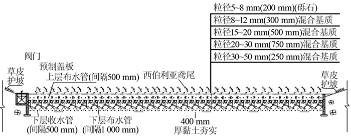 该湿地工程建于河南省许昌市清潩河沿线,处理水量4万m3/d,总占地面积14.67万m2(含附属配套设施),采用垂直流人工湿地工艺。垂直流人工湿地池深2.0 m,基质孔隙率35%,水力停留时间24 h,水力负荷0.82 m3/(m2·d),水力坡度1%,基质床自上而下铺设砾石、石灰石/硫磺/硫铁矿混合基质(石灰石、硫磺、硫铁矿的体积比5:4:1),砾石粒径5~8 mm,铺设厚度20 cm,其上种植以西伯利亚鸢尾为主的水生挺水植物,混合基质粒径8~50 mm,按不同粒径分4层铺设,厚度分别为30、50、75、25 cm,底部均匀铺设D=150 mm曝气管,曝气干管上装有控制阀用于调控溶解氧浓度,垂直流人工湿地单体结构见图1。