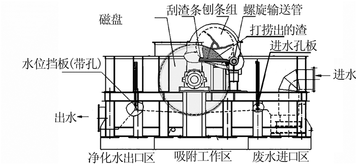 针对该厂面临的污泥脱水困难的问题,为提高回用水水质、降低生产成本,该厂引入稀土磁盘分离净化设备。稀土磁盘分离净化设备的结构原理图如图1所示。