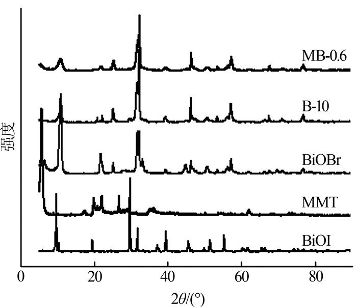 BiOI、BiOBr、MMT、B-10、MB-0.6的XRD分析见图1。
