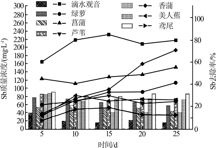 由图1可知,经过25 d的水培实验,各反应器内剩余Sb的质量浓度有所差异,滴水观音对实验水体中Sb的削减可以分为快速削减阶段(前5 d)、缓慢削减阶段(5~10 d)、释放阶段(15~20 d)和慢速削减阶段(20~25 d)。滴水观音前5 d对Sb的平均去除率可以达到60.5%,明显高于其他6种植物,说明滴水观音在短期内对Sb具有较高的去除能力,因此在后续动态实验中,为减小潜流湿地进水的Sb负荷,增加潜流湿地填料的使用寿命,设计了一种将种植滴水观音的表面流湿地置于潜流湿地之前的组合湿地系统。除香蒲外,各植物对水体中Sb的削减均集中在前5 d,主要是因为前期植物表皮存在吸附效果,增加了废水中Sb的去除率。之后对Sb的吸收均存在一个释放和缓慢的吸收过程。植物对Sb的释放主要是由于植物表皮细胞对Sb的过量吸收导致〔10〕。多株美人蕉在10 d后Sb去除率明显降低,叶片上开始产生褐色斑点,推测是植物对水体产生的毒害反应导致的;鸢尾对水中Sb的削减效果较差,Sb去除率稳定在5%~20%;香蒲对水中Sb的去除率随时间有明显的上升,25 d对水体中Sb的去除率达70.85%,说明香蒲在削减印染达标尾水中低浓度Sb方面具有较大的潜力。植物25 d对Sb的去除率从大到小排序分别为:滴水观音(79.63%)、香蒲(70.85%)、菖蒲(55.5%)、绿萝(41.54%)、美人蕉(26.04%)、芦苇(24.46%)、鸢尾(12.4%)。