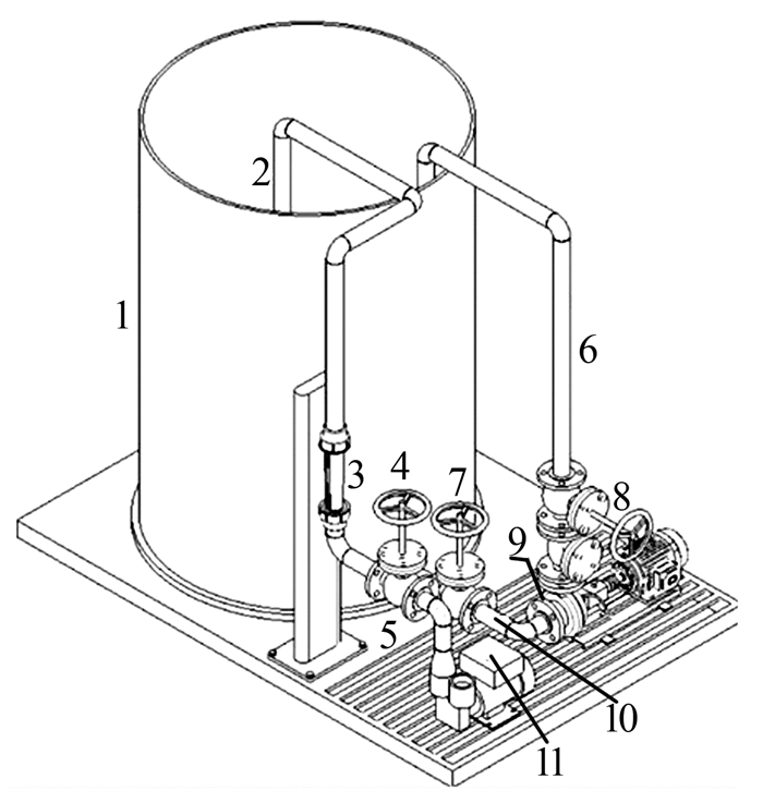 1—生物流化床主体;2—曝气头;3—气体转子流量计;4—曝气阀门;5—曝气管;6—进水管道;7—出水管道阀门;8—进水管道阀门;9—循环泵;10—出水管道;11—气泵。