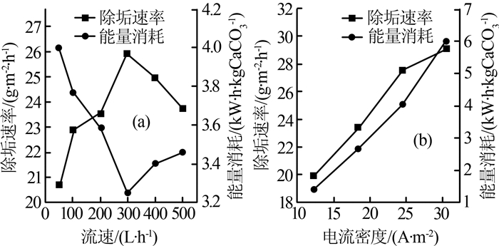 由图4可以看出,当流速为300 L/h时,除垢速率最高,可达25.9 g/(m2·h),能量消耗仅为3.25 kW·h/kgCaCO3。此外,除垢速率和能量消耗的增加与电流密度的增加基本上呈线性关系,增加电流密度,在除垢速率提高的同时,也增加了能量消耗。
