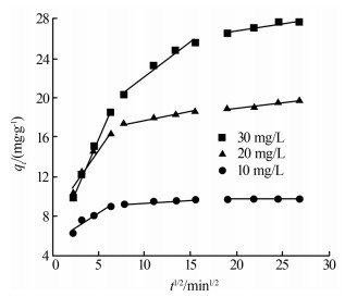 同时根据吸附动力学实验结果,进行了颗粒内扩散方程的拟合,其方程见式(1),实验结果见图5。