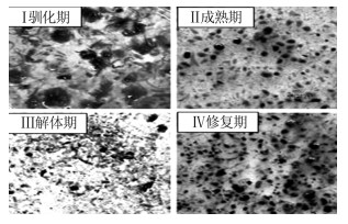 本实验在模拟废水中共运行144 d,整个实验过程分为第Ⅰ阶段驯化期(第1天—第48天),第Ⅱ阶段稳定期(第49天—第113天),第Ⅲ阶段解体期(第114天—第125天)与第Ⅳ阶段修复期(第126天—第144天)4个阶段。图1是用数码相机拍摄的颗粒污泥不同时期的形态特征。