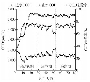 试验用水为河北省某制药公司排放的硫酸新霉素废水,废水pH 3.5~4.5、COD 25~30 g/L、SO42- 2.0~2.5 g/L、总氮3.0~3.5 g/L、硫酸新霉素550~600 mg/L,由于废水污染物浓度过高,需根据运行条件适当稀释。