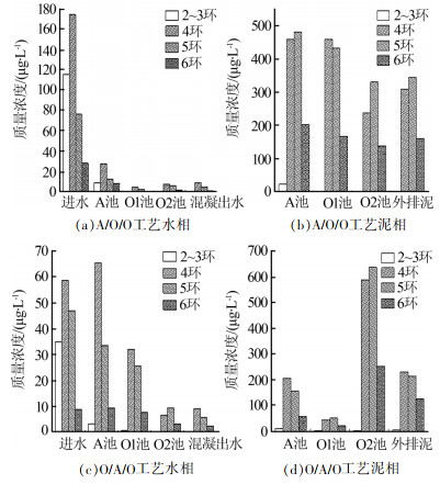 (1)考察了A/O/O工艺与O/A/O工艺的水相PAHs的分布行为,发现A/O/O工艺对于水相中总PAHs的去除率为95.85%,高于O/A/O工艺的88.50%,因此从进出水PAHs的削减量可知,A/O/O工艺优于O/A/O工艺。