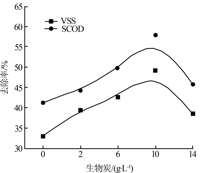 从图5可以看出,在生物炭质量浓度2~10 g/L范围内,两相厌氧消化系统对VSS和SCOD的去除率均随浓度呈上升趋势,分别由33.1%±1.4%和41.3%±1.1%上升到49.3%±1.5%和57.8%±1.3%。而当生物炭质量浓度为14 g/L时,由于产甲烷反应器运行性能的下降,导致整个系统对VSS和SCOD的去除率明显下降,分别下降至38.5%±1.3%和45.9%±1.2%。尽管VSS和SCOD去除率仍高于对照反应器,但从长远运行考虑,生物炭质量浓度14 g/L不利于两相厌氧消化系统的运行。本研究确定最优的生物炭质量浓度为10 g/L,在此浓度下两相厌氧消化系统的运行性能最高。