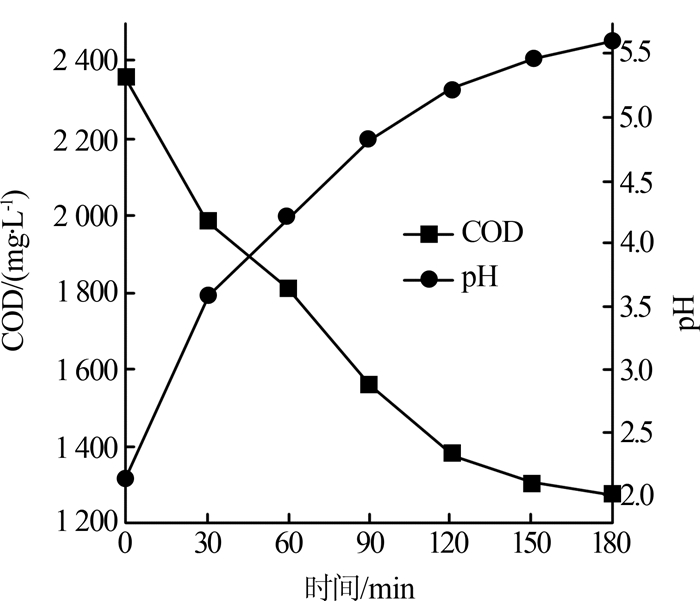 微电解过程中,COD、pH随时间变化见图3。