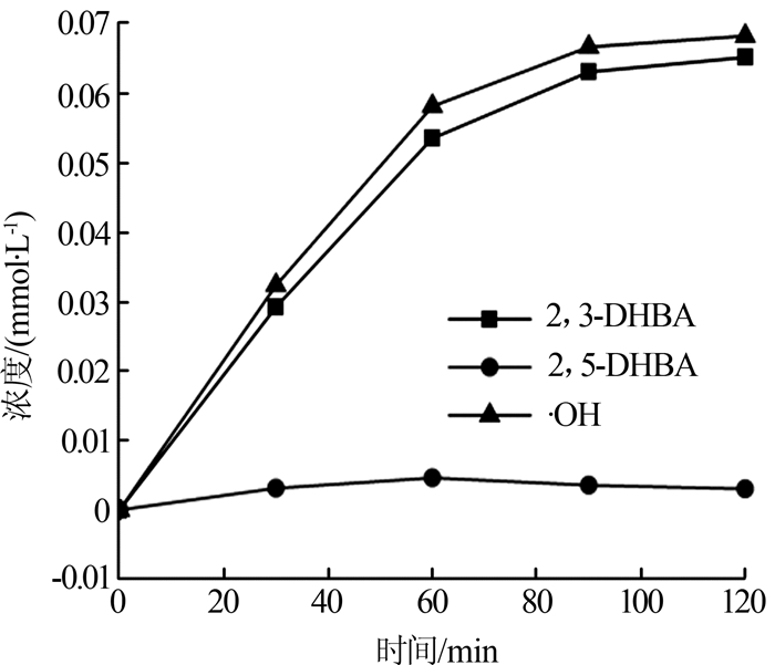 用水杨酸捕获法测定反应器中·OH产率。向反应溶液中加入1 mol/L水杨酸,在预定时间取样,用高效液相色谱仪检测水杨酸反应产物2,3-二羟基苯甲酸(2,3-DHBA)和2,5-二羟基苯甲酸(2,5-DHBA)的含量,二者浓度之和可反映体系中·OH的含量〔6〕。液相色谱仪配备反相色谱柱(ODS-C18)和紫外检测器,流动相为60%的甲醇水溶液,用磷酸调节溶液pH至2.01,流速为0.6 mL/min,检测波长为300 nm。