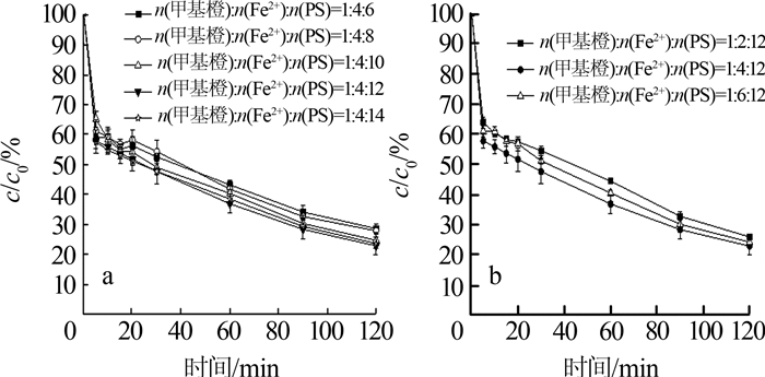 综上,反应最佳pH为4。当n(甲基橙):n(Fe2+):n(PS)=1:4:12时,调节pH并不能有效增加甲基橙去除率。实际应用中,相比于调节pH,调控药剂比例更可能增加对废水的处置效果。