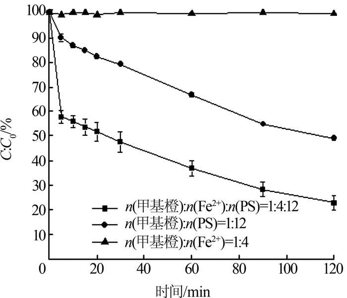 在上述最佳条件下,考察单独亚铁处理、单独PS处理及Fe2+/PS体系对甲基橙的降解效果,见图2。