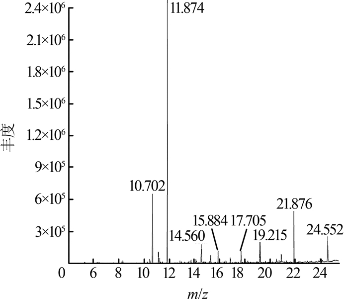 以上结果表明,pH降低有利于提高酸析处理的效果。此外,对酸析废物进行GC-MS分析(见图1),发现酸析废物的主要成分为苯酚。酸性环境有利于苯酚发生沉降,使废水COD降低。