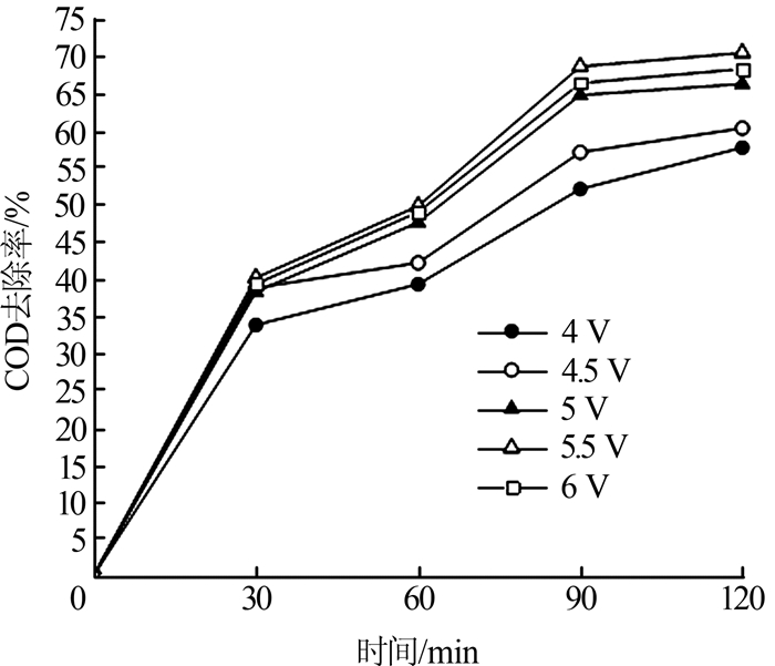 在二维电极极板间加入10 g活性炭颗粒作为粒子电极,用玻璃纤维网将其与极板隔离,构建三维电极体系。用该体系对垃圾渗滤液纳滤浓缩液进行电催化氧化处理,选取极板电压为4、4.5、5、5.5、6 V,每隔30 min对三维电极体系中的污水进行取样,考察不同电压下COD去除率与时间的变化关系,如图1所示。