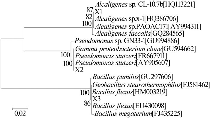 由图2可知, X1、X2能在质量分数为2%~10%的NaCl环境中生长, X3可在2%~6%的NaCl环境中生长,但盐度对菌株生长速率有很大影响。随着盐度的增加,菌株生长曲线的适应期变长,对数增长期的生长速率变慢。适应期变长的原因在于,接种到不同的盐度环境后,微生物需经过一定时间的调整和适应,自身合成多种酶进一步完善体内的酶系统后,才会生长繁殖。而在高盐环境下酶合成速度下降,产生新的酶系统需要耗费一定时间。在对数生长期微生物虽然处于营养过剩状态,但对数增长期增长速率变慢。高盐环境下微生物在抵御外在不良环境的同时,需要耗费大量能量调整自身的代谢途径,或分泌胞外多聚物抵御外界不良环境因子的作用,同时需要能量合成自身生长所需物质。这样导致用于生长繁殖的能量相对减少,自身生长速率变小,世代时间变长。减速生长期历时变长可能是由于微生物利用底物的速率下降,微生物存活率低,导致营养物质剩余〔8〕。
