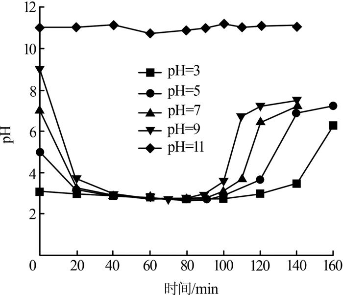 图 4为不同初始pH下反应过程中pH的变化情况。