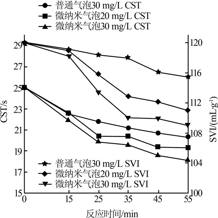 (2)污泥减量化过程中,臭氧微纳米气泡较普通气泡对污泥沉降性能和脱水性能的改善程度更高,30 mg/L的臭氧纳米气泡处理55 min后,污泥SVI最低可降至109 mL/g左右,此时CST降至18.1 s;微纳米气泡较普通气泡可以较大程度提升污泥稳定性,MLVSS/MLSS可降至0.55左右。