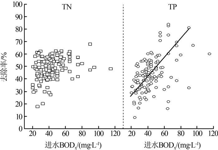 脱氮除磷受碳源影响,进水BOD5/COD > 0.30的累积概率为85%,可生化性良好。该厂BOD5/TN > 4的概率仅为2%,反硝化碳源严重不足,进水BOD5/TN大于4~6才能保证反硝化碳源。BOD5/TP > 20的概率为89%,TN/TP > 5的概率为100%,进水可以满足生物除磷的要求。图 4是进水BOD5对脱氮除磷的影响,TP去除率随进水BOD增大而升高,而TN去除率不随进水BOD变化,表明碳源被优先用于除磷。挑选主成分PC1中荷载值较大的因子,采用逐步回归建立了出水TN的表达式,见式(3)。